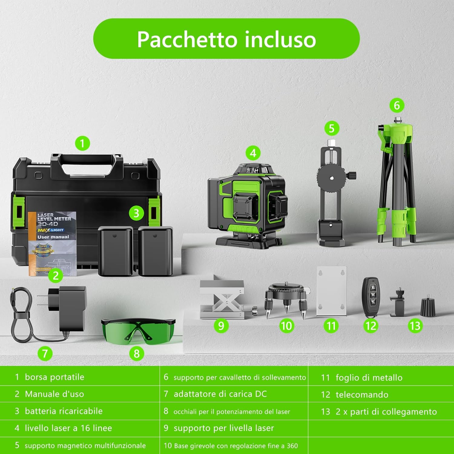 【Durable Design/Verpackungsliste】IP54 wasserdicht/dusterproof, um sicherzustellen, dass Sie normal und stabil unter komplexen Arbeitsbedingungen arbeiten können. 1x 4D 16 Linien nivellierlaser, 1x Tragetasche, 1x Ladegerät, 1x 1/4„-Laufflächenhalterung, 1x 5/8-20“-Laufflächenhalterung, 1x Wandeisen, 1x Benutzerhandbuch, 1x Fernbedienung, 1x grüne Zielplatte, 1x Wandhalterung, 1x Hebeplattform, 2x 2400mAH Batterien,1xDreifuß,1xSchutzbrille