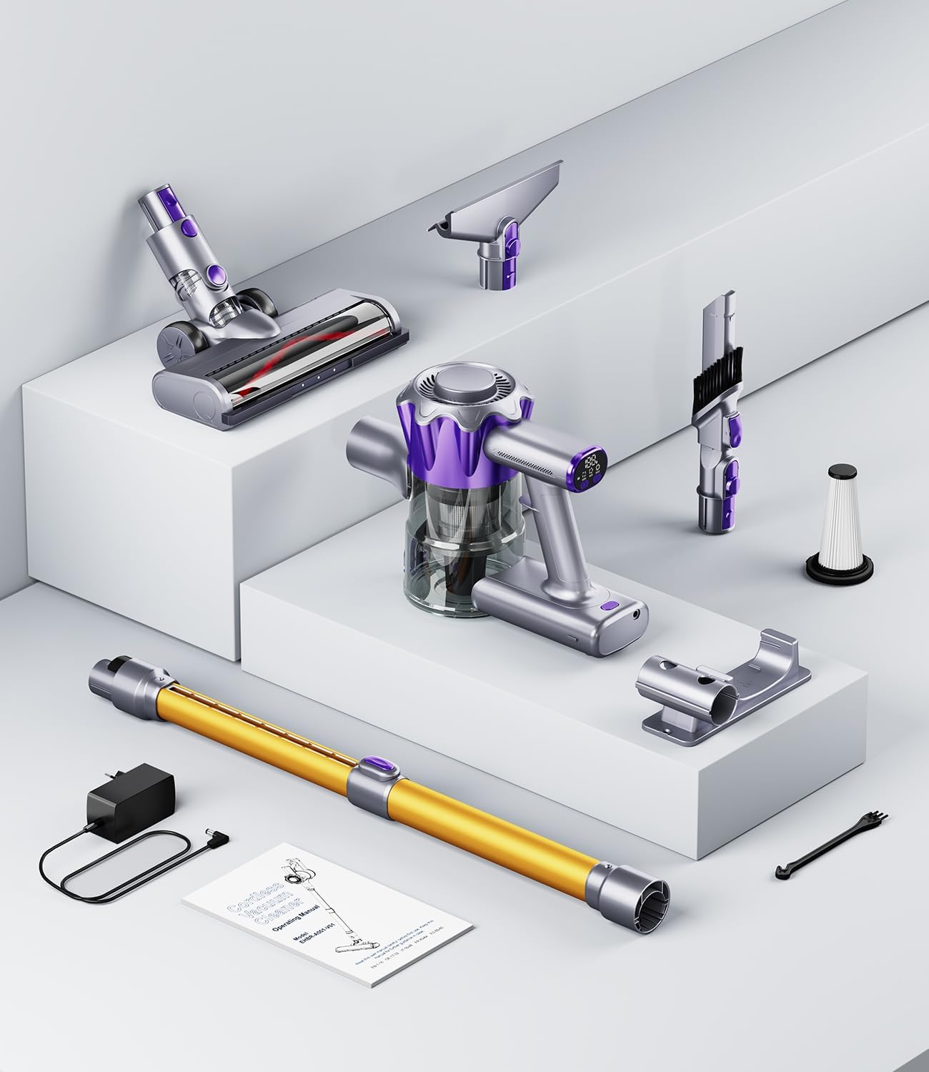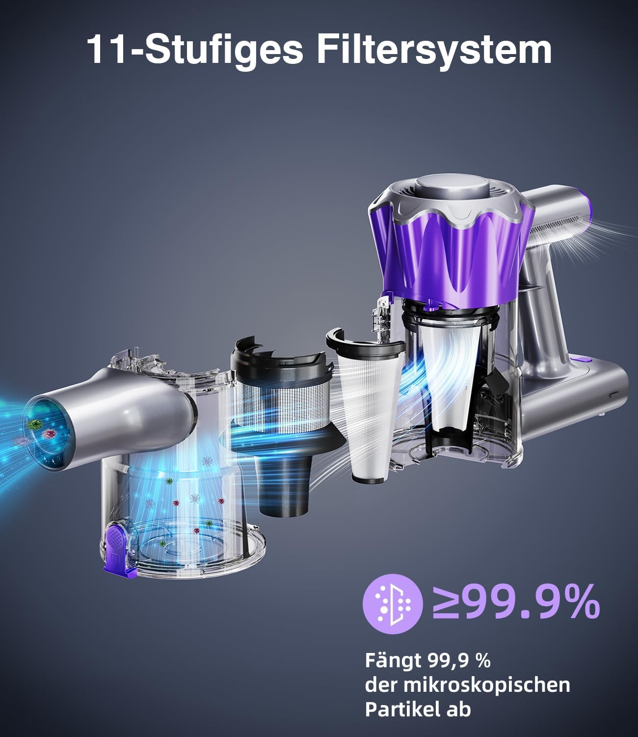 【99,99% Hochwirksame Filterung + 1,5L großer Staubbehälter】Dank der doppelten Wirbelstruktur bietet dieser akku staubsauger kabellos eine noch stärkere Zyklon-Trennung. Das 11-Schicht-Filtersystem entfernt 99,99% aller winzigen Staubpartikel, Bakterien und Milben unter 0,3 μm - ideal für Allergiker und Haustierbesitzer. Mit einem 1,5-Liter-Staubbehälter ist die Reinigung des gesamten Hauses ein Kinderspiel.