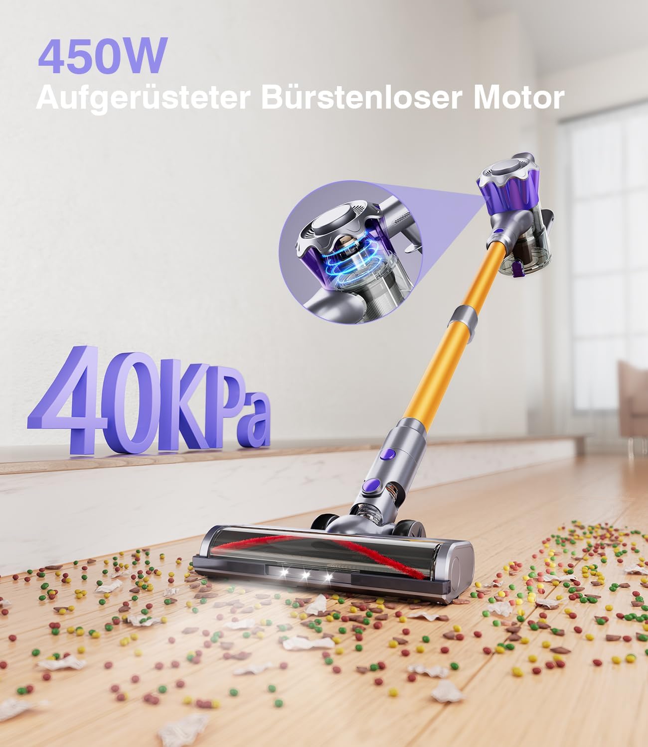 【40KPa Leistungsstarke Saugkraft】Akku staubsauger kabellos verfügt über einen aufgerüsteten 450W Motor, mit einer Saugkraft von bis zu 40000PA, was die Arbeitseffizienz erheblich steigert. Verabschieden Sie sich von kleinen Partikeln, Tierhaaren und Schmutz auf Teppichen, Hartböden und Fliesen und erleben Sie eine ruhige und effiziente Reinigung, die Ihr Zuhause in neuem Glanz erstrahlen lässt.