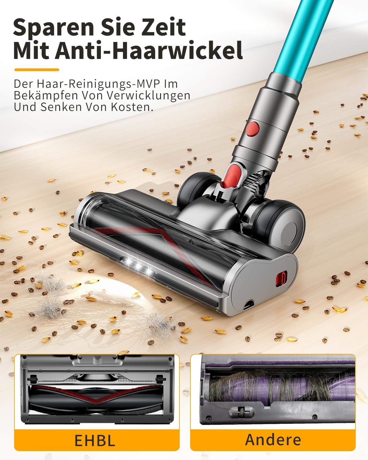 【Flexible Anti-Verhedderungsbürste】Kabelloser staubsauger testsieger ist mit einer verbesserten V-förmigen Anti-Verhedderungsrolle ausgestattet, die sicherstellt, dass Haare reibungslos durch den Luftkanal des akkusauger kabellos gelangen und Verwicklungen reduziert werden. Der Bürstenkopf ist äußerst flexibel und kann sich seitlich von 0° bis 180° und auf und ab von 0° bis 90° bewegen. Mit hellen LED-Leuchten ausgestattet, ermöglicht er eine bessere Reinigung der Ecken.