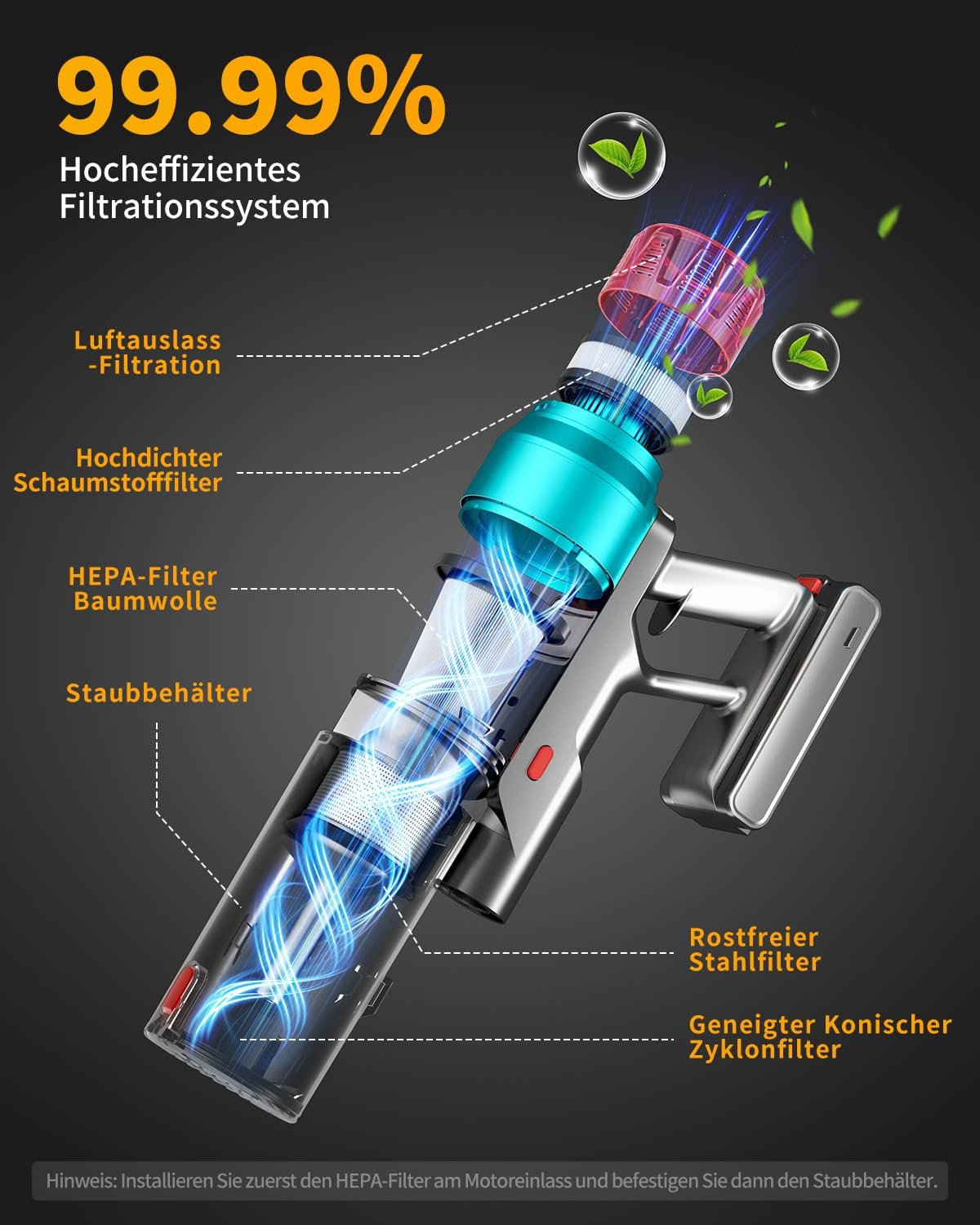 【99,99% Hochwirksame Filterung + 1,6L großer Staubbehälter】Dank der doppelten Wirbelstruktur bietet dieser akku staubsauger kabellos eine noch stärkere Zyklon-Trennung. Das 11-Schicht-Filtersystem entfernt 99,99% aller winzigen Staubpartikel, Bakterien und Milben unter 0,3 μm - ideal für Allergiker und Haustierbesitzer. Mit einem 1,6-Liter-Staubbehälter ist die Reinigung des gesamten Hauses ein Kinderspiel.