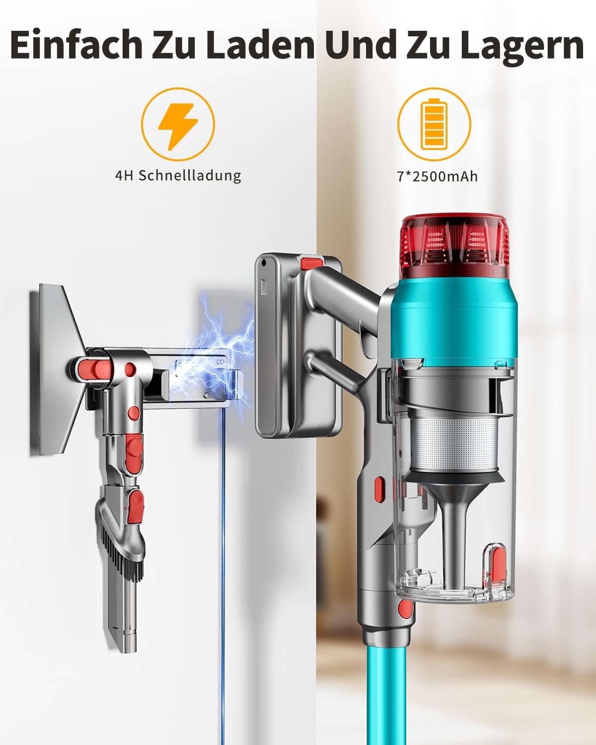 【Wiederaufladbar & Wandhalterung zur Aufbewahrung】Dank ihm vergessen Sie nie das Aufladen. Der akku staubsauger kabellos wird mit einer wiederaufladbaren Wandhalterung geliefert. Nach Gebrauch stecken Sie einfach die Wandhalterung ein, um mit dem Aufladen zu beginnen, und bewahren Sie Zubehör ordentlich in den integrierten Schlitzen auf. Eine einfache Möglichkeit zum Laden und Aufbewahren.