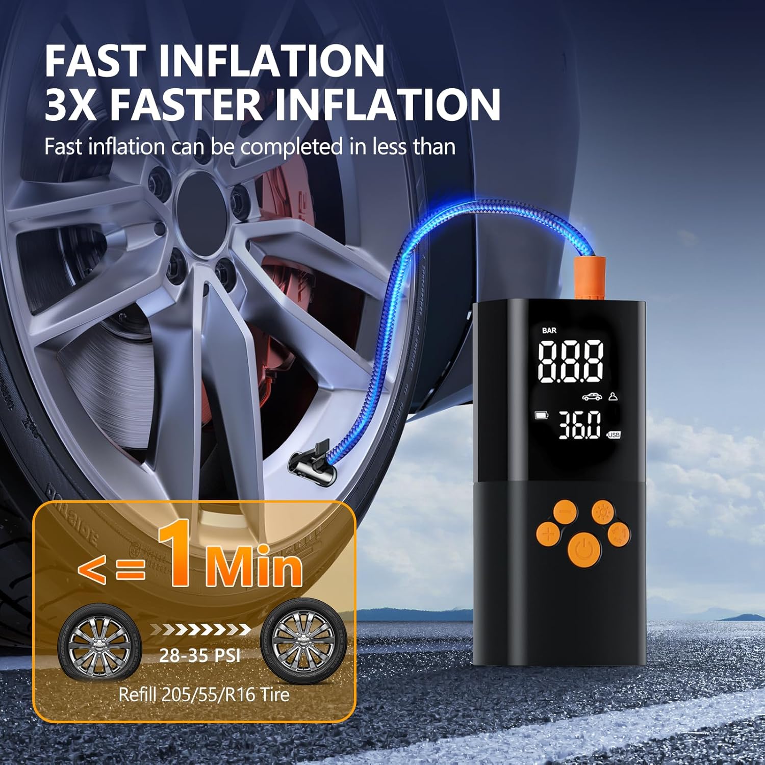 【4x schnellere Inflation und hohe Genauigkeit】Die luftpumpe elektrisch ist das neueste Design aus dem Jahr 2026 und ist mit einem hocheffizienten Motor ausgestattet, der die Aufblasgeschwindigkeiten auf bis zu 36L / Min erhöht, so dass es weniger als 5 Minuten dauert, um einen 195/65/R15-Autoreifen von 0 psi auf 35 psi zu aufblasen. Darüber hinaus wird unser fahrradpumpe elektrisch auf ±1% gehalten. Es ist der perfekte Begleiter für die Straße!