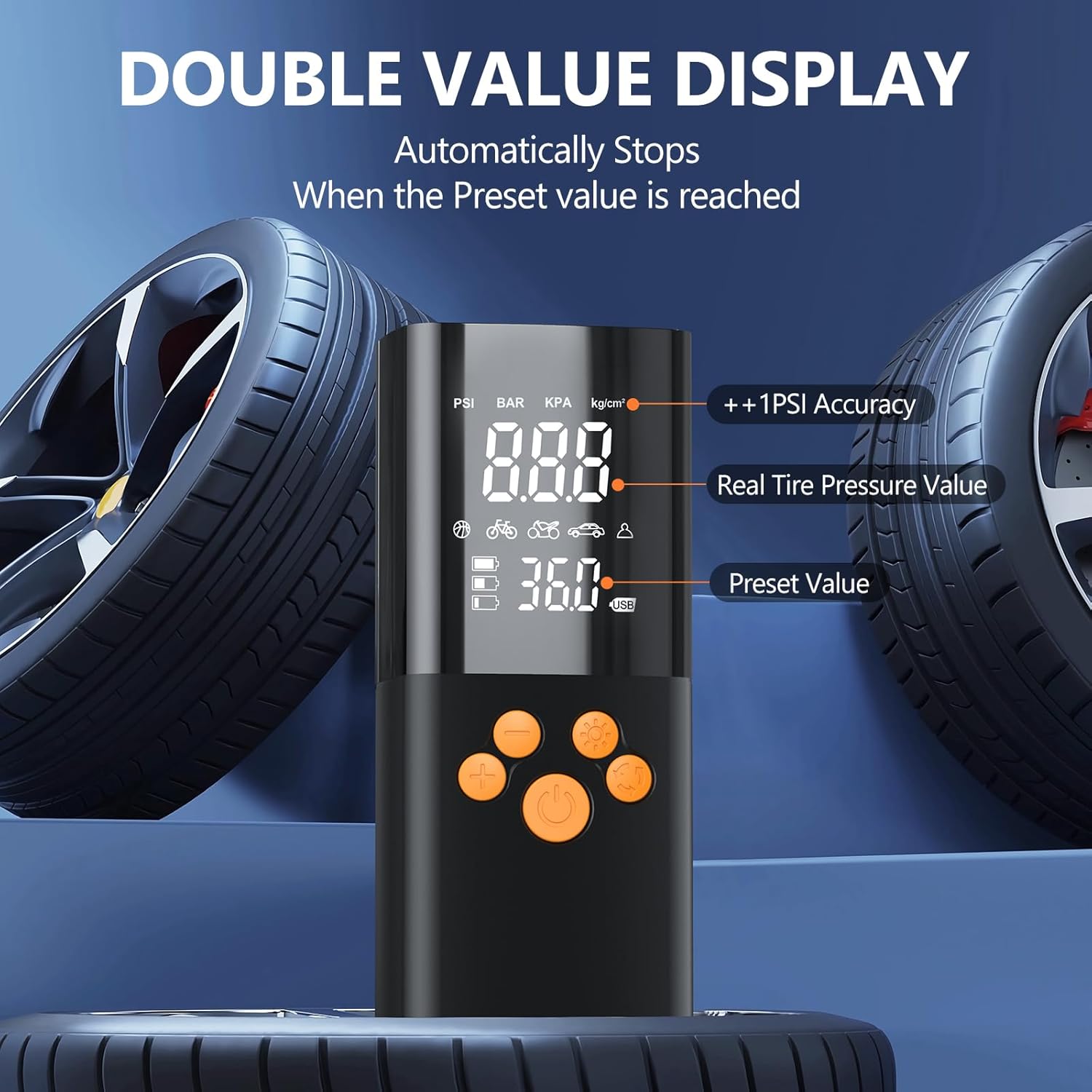 【4+N INTELLIGENTE MODI】Tragbare elektrische fahrradpumpe sind mit 4 Druckeinheiten: PSI, KPA, BAR, KG / CM² und vier voreingestellten Aufblasmodi: Fahrrad, Motorrad, Auto und Ball. Der fünfte individuelle Modus ermöglicht die Druckwerteinstellung nach dem aufzupumpenden Objekt und ist einfach zu bedienen. Die tragbare akku fahrradpumpe ist ein unverzichtbares Produkt für den Alltag und Reisen.