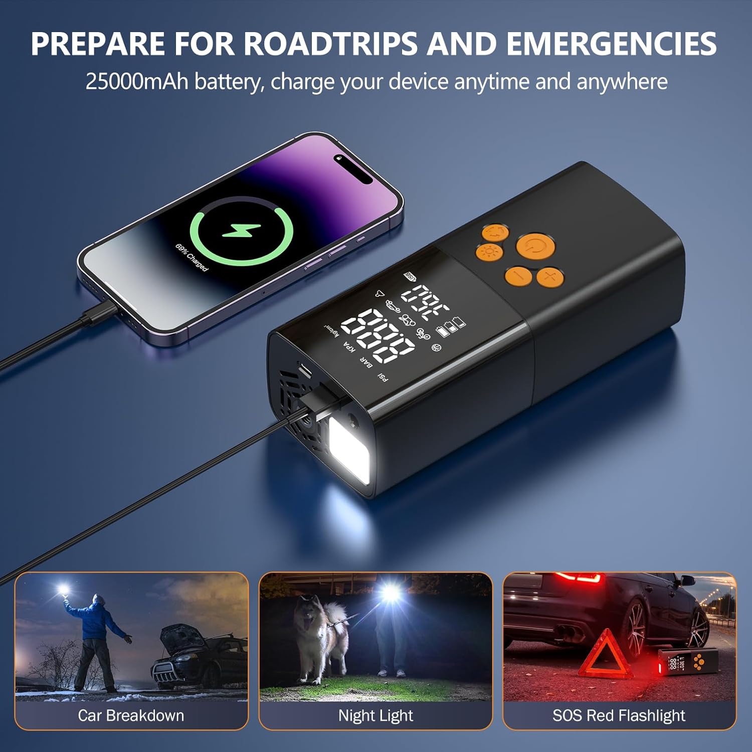 【Dauerhafter Kraftreifenaufblaser】Ausgestattet mit einer Kapazität von 25000mAh, dauert die elektrische luftpumpe für Autoreifen 3 Stunden kontinuierlicher Gebrauch und kann in nur 2-4 Stunden vollständig geladen werden, und der akku luftpumpe kann auf zwei Weise verwendet werden, entweder drahtlos oder mit dem Autokabel, um aufzublasen, wenn die Batterie ausläuft. Es kann 16 Autoreifen oder 40 Rennräderreifen aufladen, fern von Problemen mit niedriger Stromversorgung.