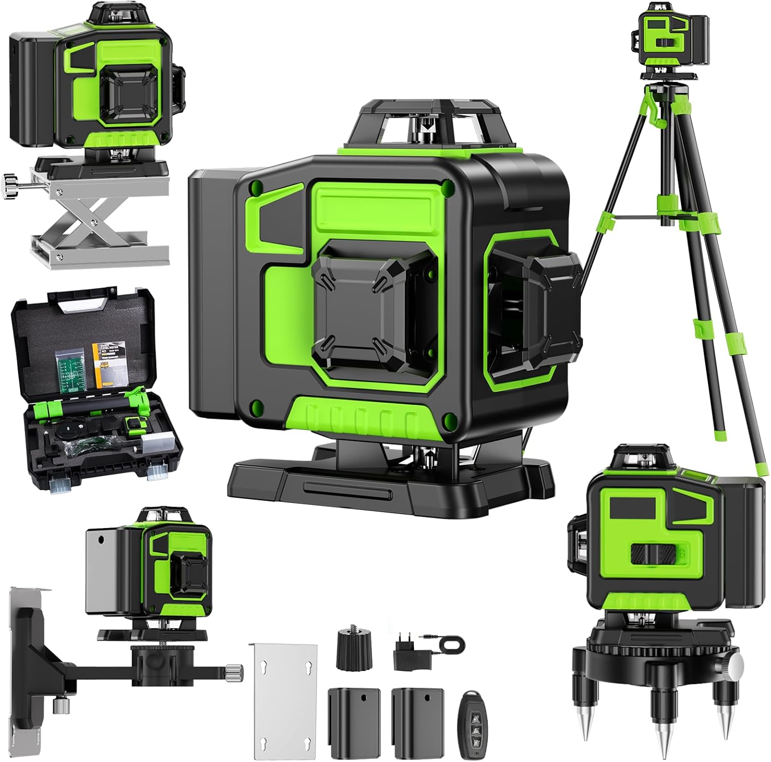 【Durable Design/Verpackungsliste】IP54 wasserdicht/dusterproof, um sicherzustellen, dass Sie normal und stabil unter komplexen Arbeitsbedingungen arbeiten können. 1x 4D 16 Linien nivellierlaser, 1x Tragetasche, 1x Ladegerät, 1x 1/4„-Laufflächenhalterung, 1x 5/8-20“-Laufflächenhalterung, 1x Wandeisen, 1x Benutzerhandbuch, 1x Fernbedienung, 1x grüne Zielplatte, 1x Wandhalterung, 1x Hebeplattform, 2x 2400mAH Batterien,1xDreifuß,1xSchutzbrille