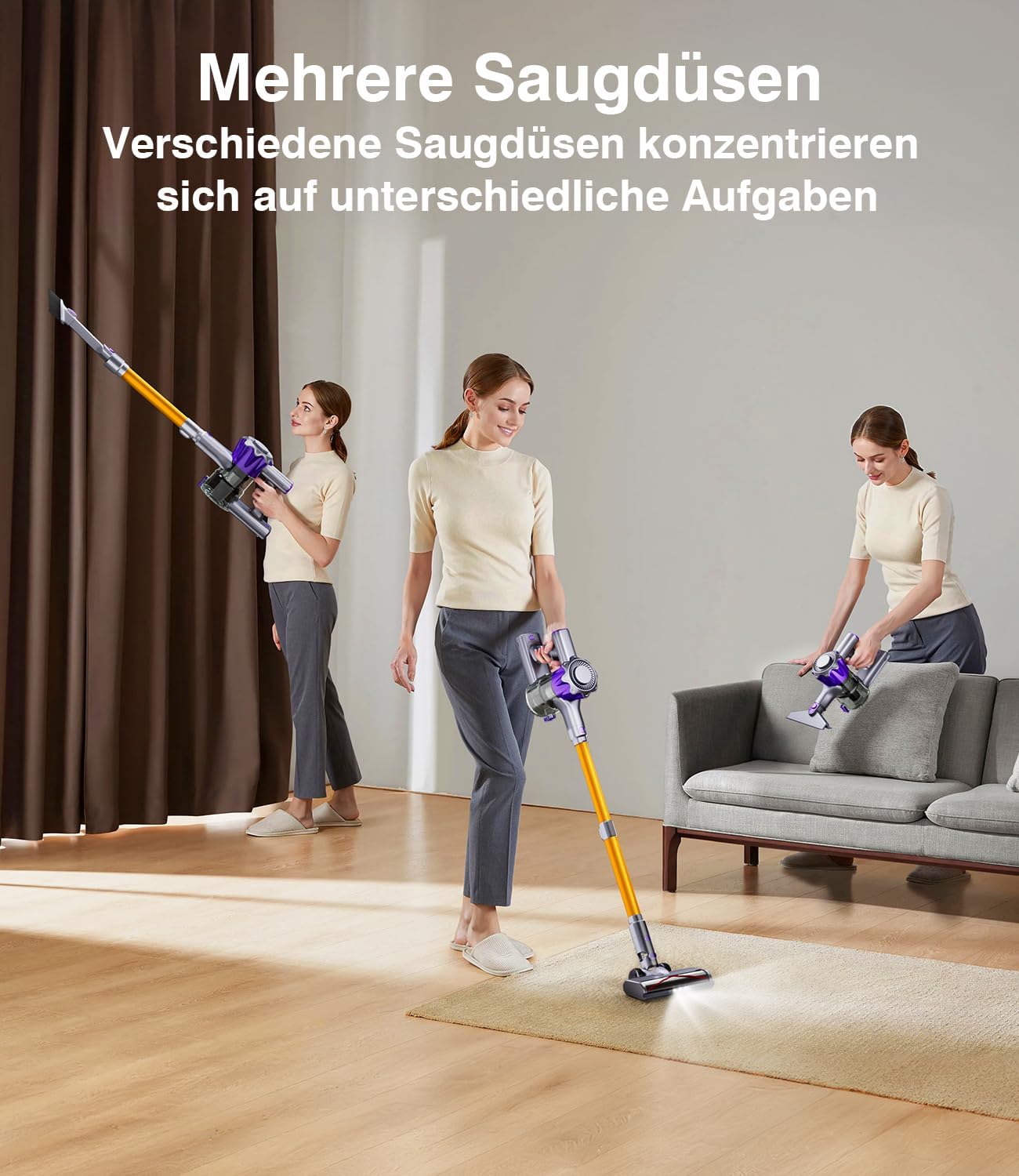 【40KPa Leistungsstarke Saugkraft】Akku staubsauger kabellos verfügt über einen aufgerüsteten 450W Motor, mit einer Saugkraft von bis zu 40000PA, was die Arbeitseffizienz erheblich steigert. Verabschieden Sie sich von kleinen Partikeln, Tierhaaren und Schmutz auf Teppichen, Hartböden und Fliesen und erleben Sie eine ruhige und effiziente Reinigung, die Ihr Zuhause in neuem Glanz erstrahlen lässt.