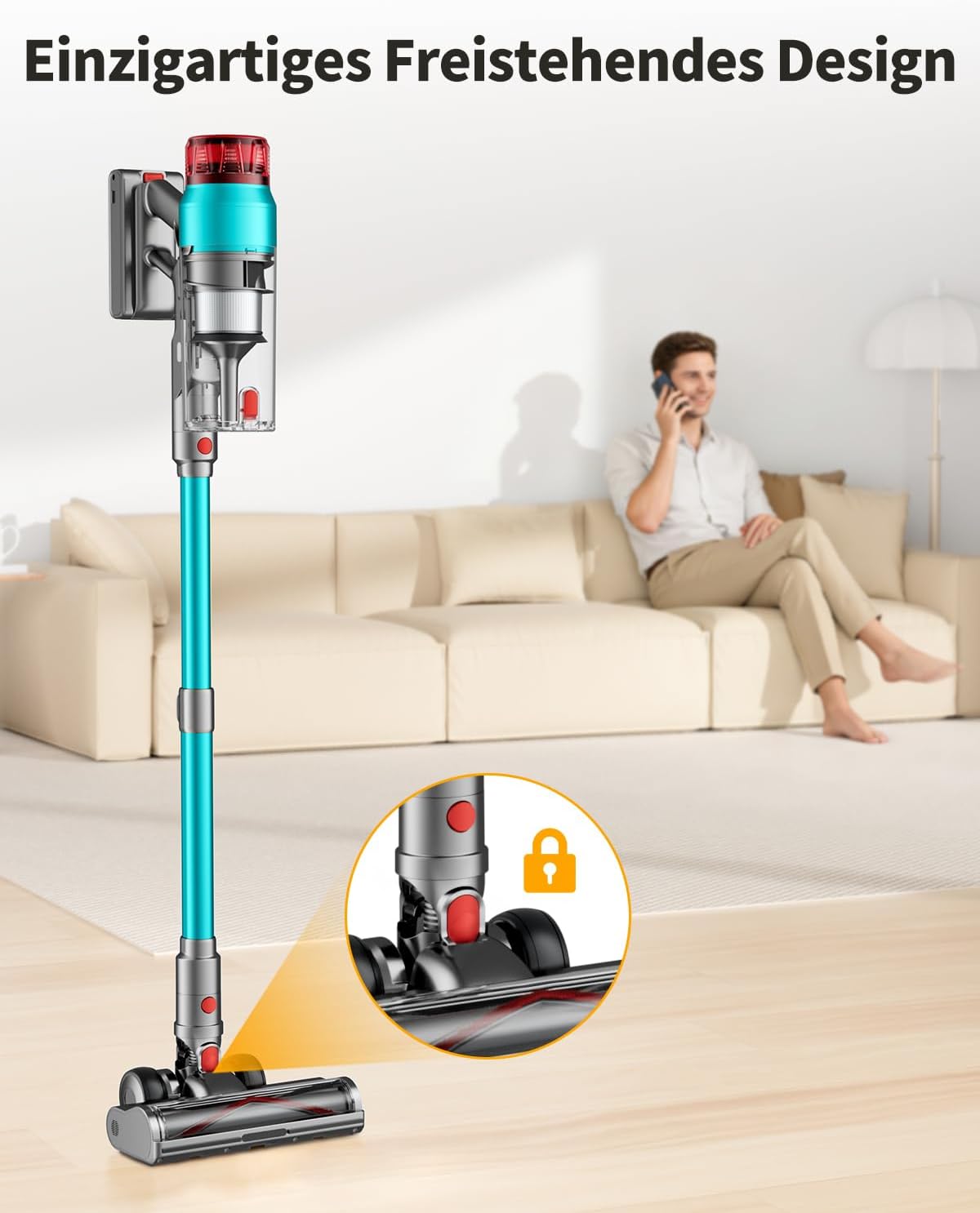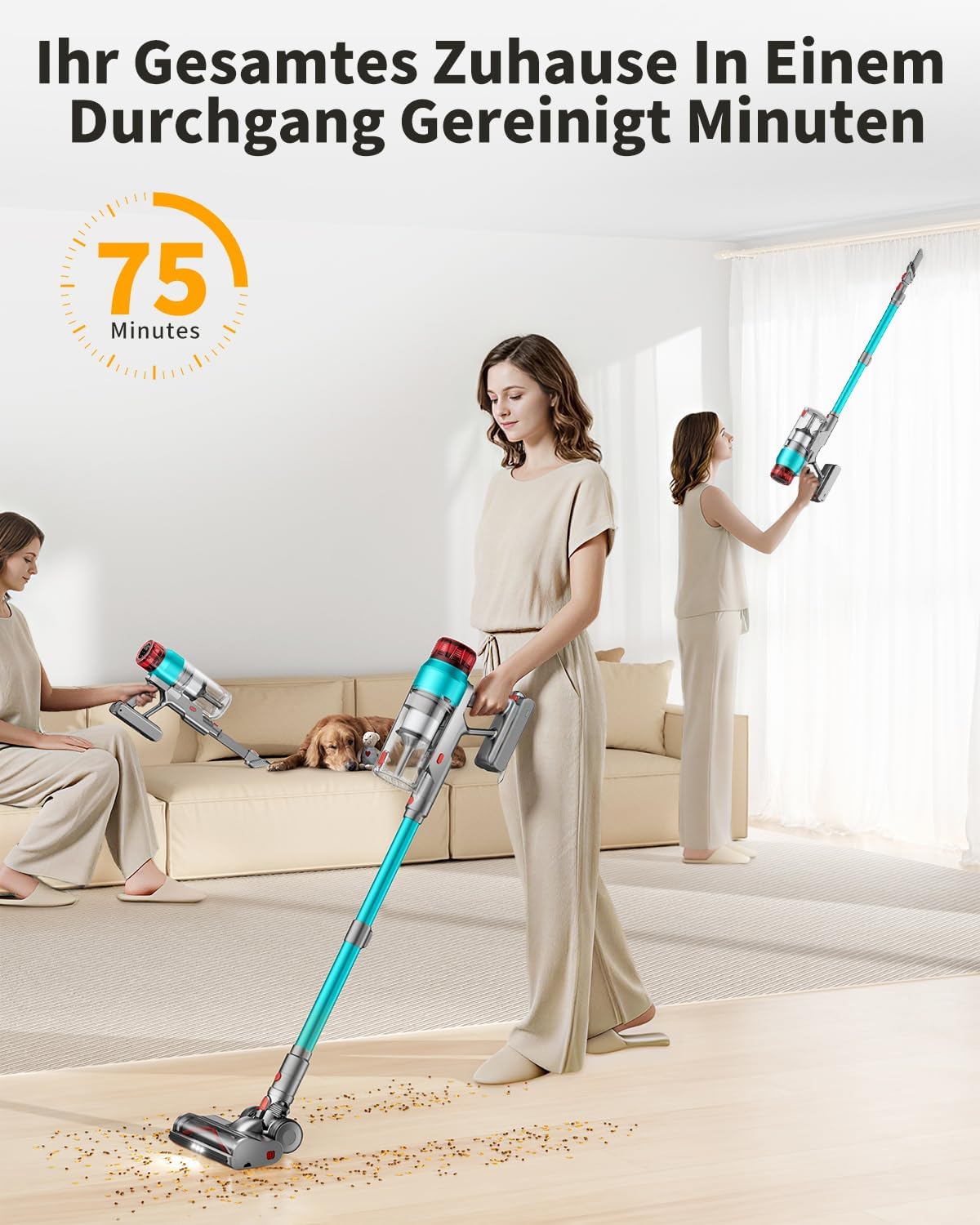 【60KPa Leistungsstarke Saugkraft】Akku staubsauger kabellos verfügt über einen aufgerüsteten 600W Motor, mit einer Saugkraft von bis zu 60000PA, was die Arbeitseffizienz erheblich steigert. Verabschieden Sie sich von kleinen Partikeln, Tierhaaren und Schmutz auf Teppichen, Hartböden und Fliesen und erleben Sie eine ruhige und effiziente Reinigung, die Ihr Zuhause in neuem Glanz erstrahlen lässt.